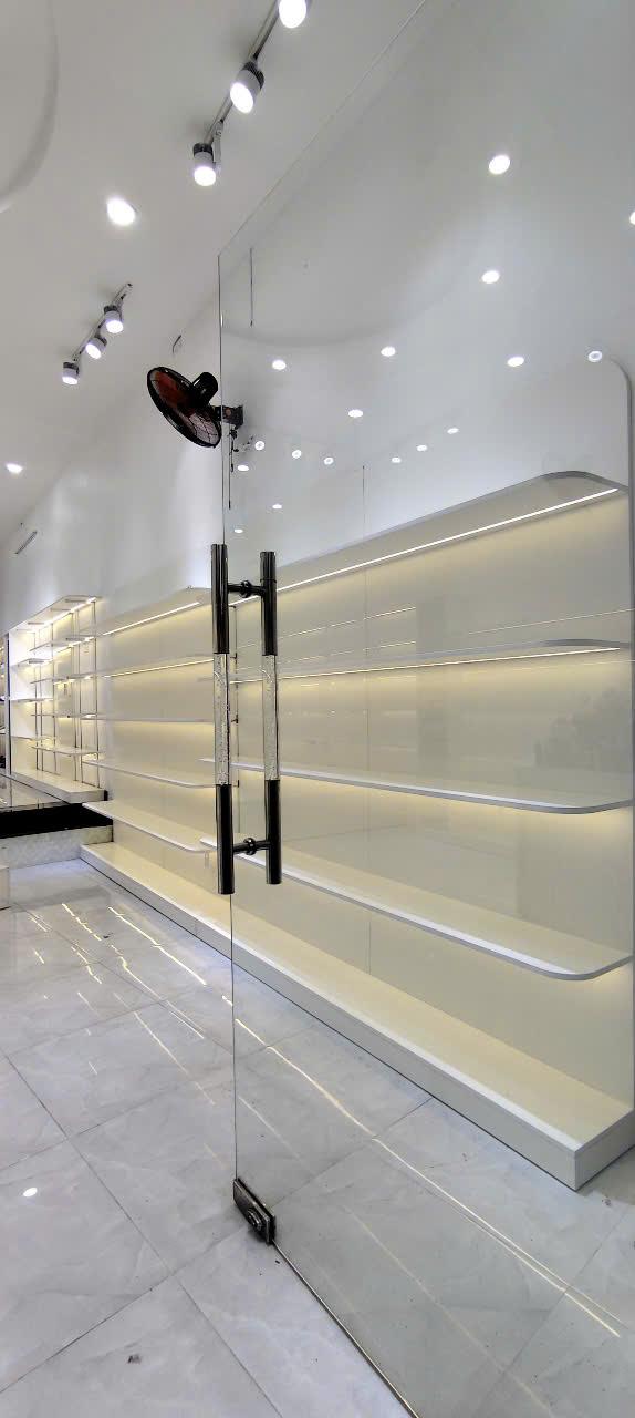Chúng tôi thiết kế kệ trưng bày sát tường, kết hợp kệ trung tâm di động, giúp tối ưu hóa mặt bằng nhỏ, tạo lối đi rộng rãi và dễ quan sát toàn bộ sản phẩm.